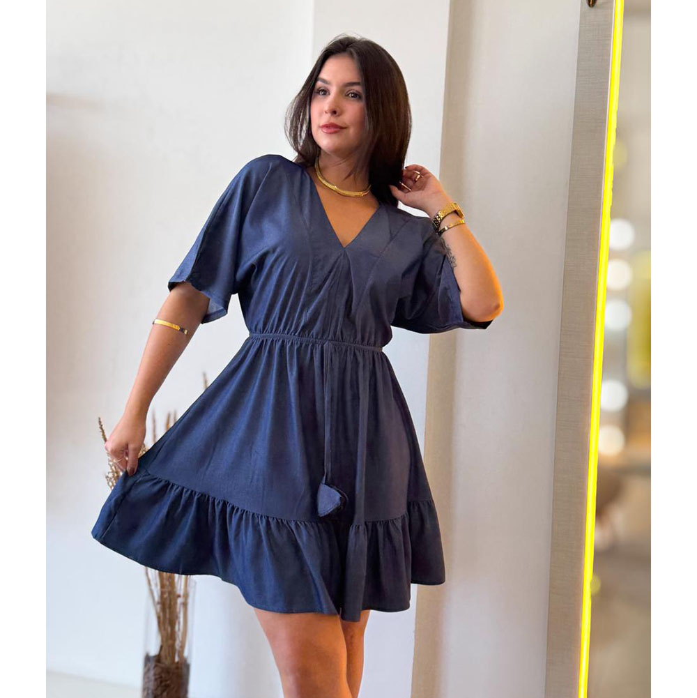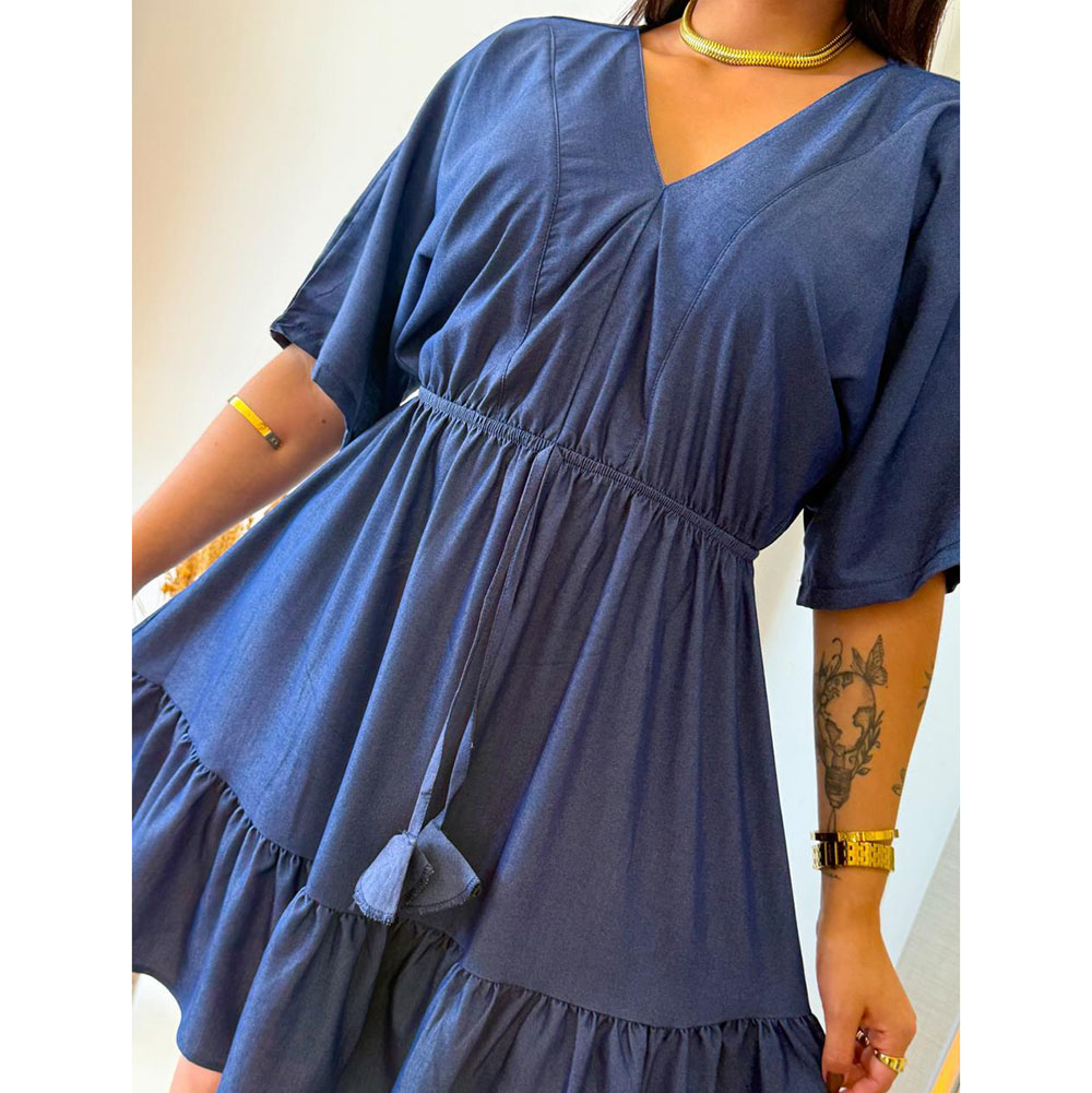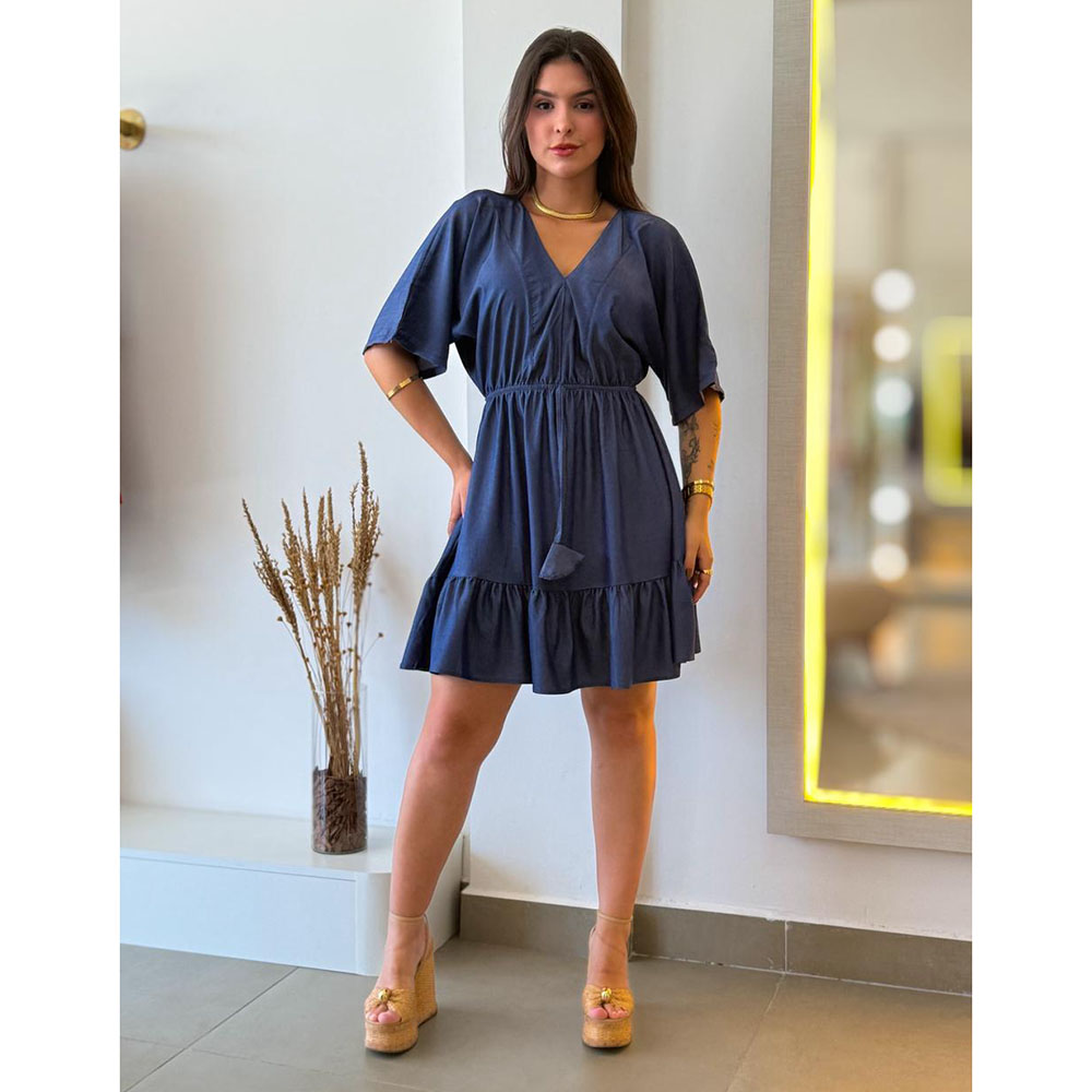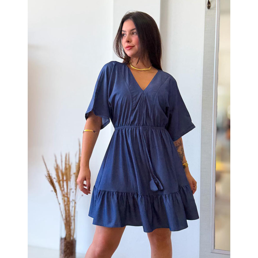 Vestido curto confeccionado em jeans leve de textura fina, proporcionando conforto e elegância. O modelo apresenta decote em ‘V’, mangas amplas e cintura com elástico e amarração fake. A saia com babados acrescenta sutileza e movimento à peça, criando um visual sofisticado e versátil para diferentes ocasiões.