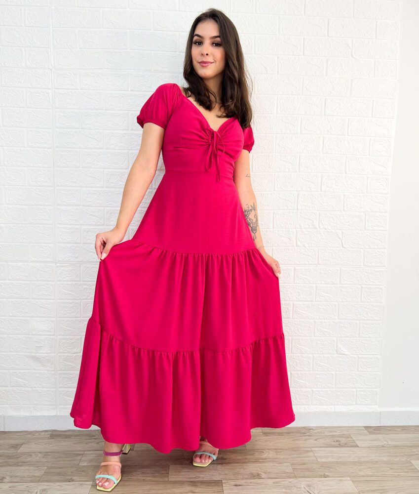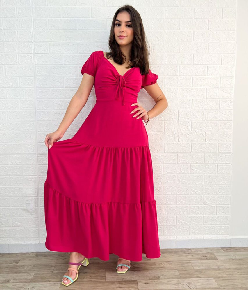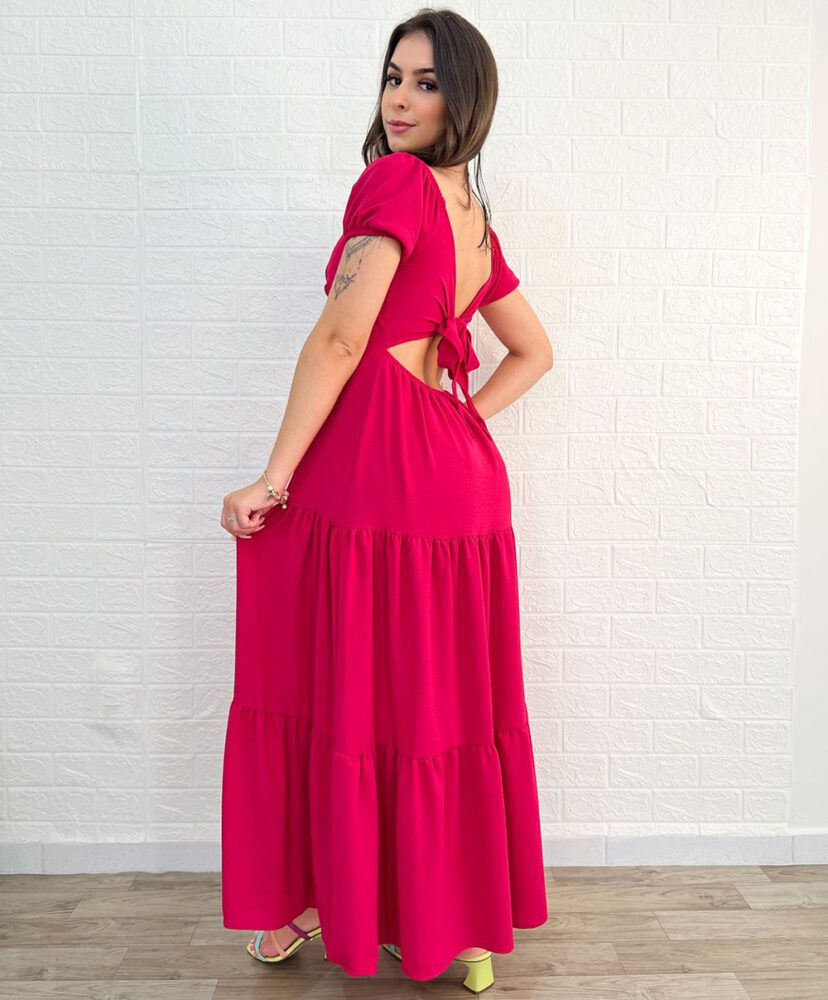 Vestido Longo, Ciganinha, em Duna, com bojo, decote ajustavel, com forro, abertura e fechamento com amarração nas costas.
