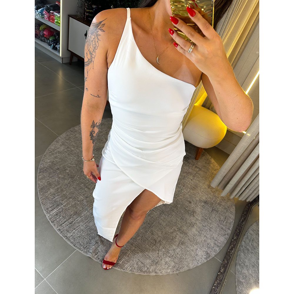Vestido Longo em Alfaiataria, Com Alça Mulamanca, Ziper nas costas, Com Detalhe na Frente e Fenda na Lateral