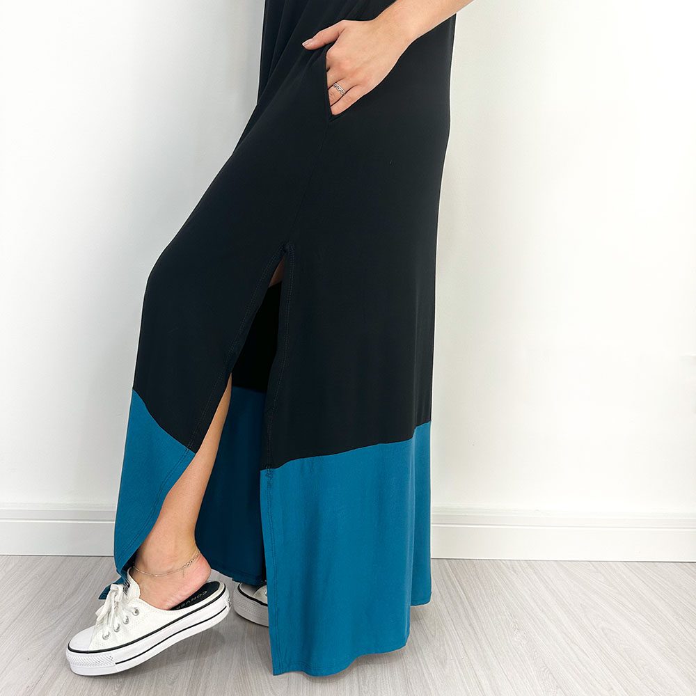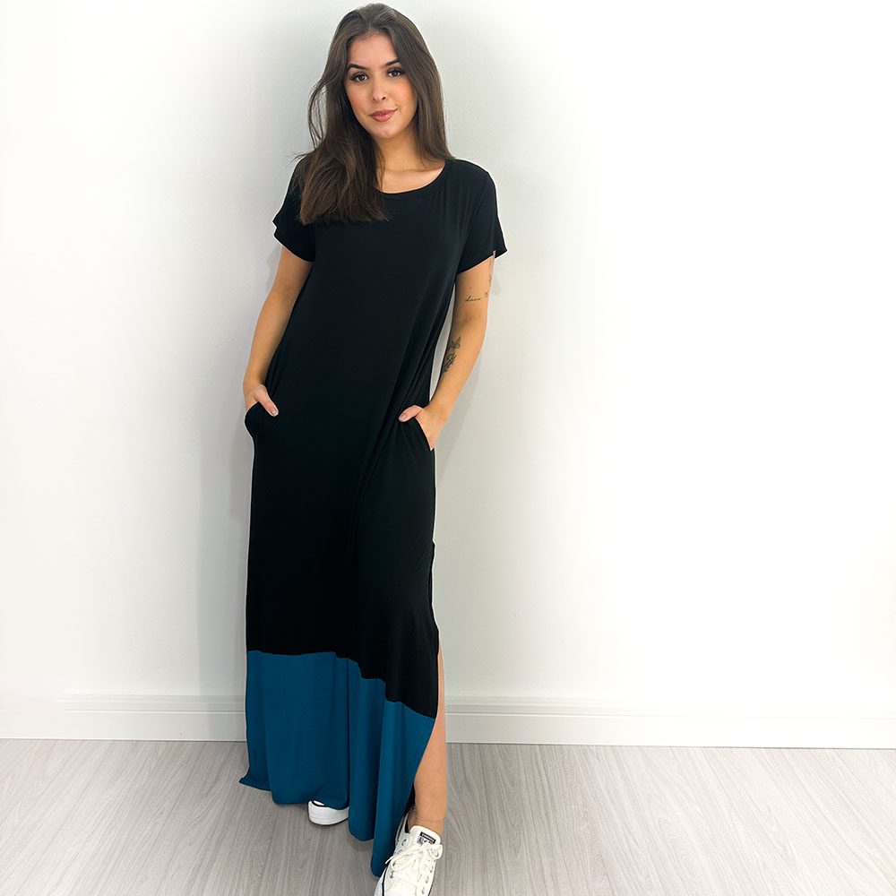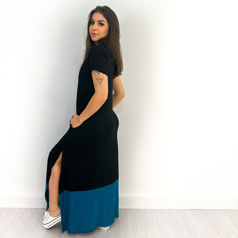Seja o primeiro a avaliar “Vestido Longo em Malha Preto com Azul Petróleo”