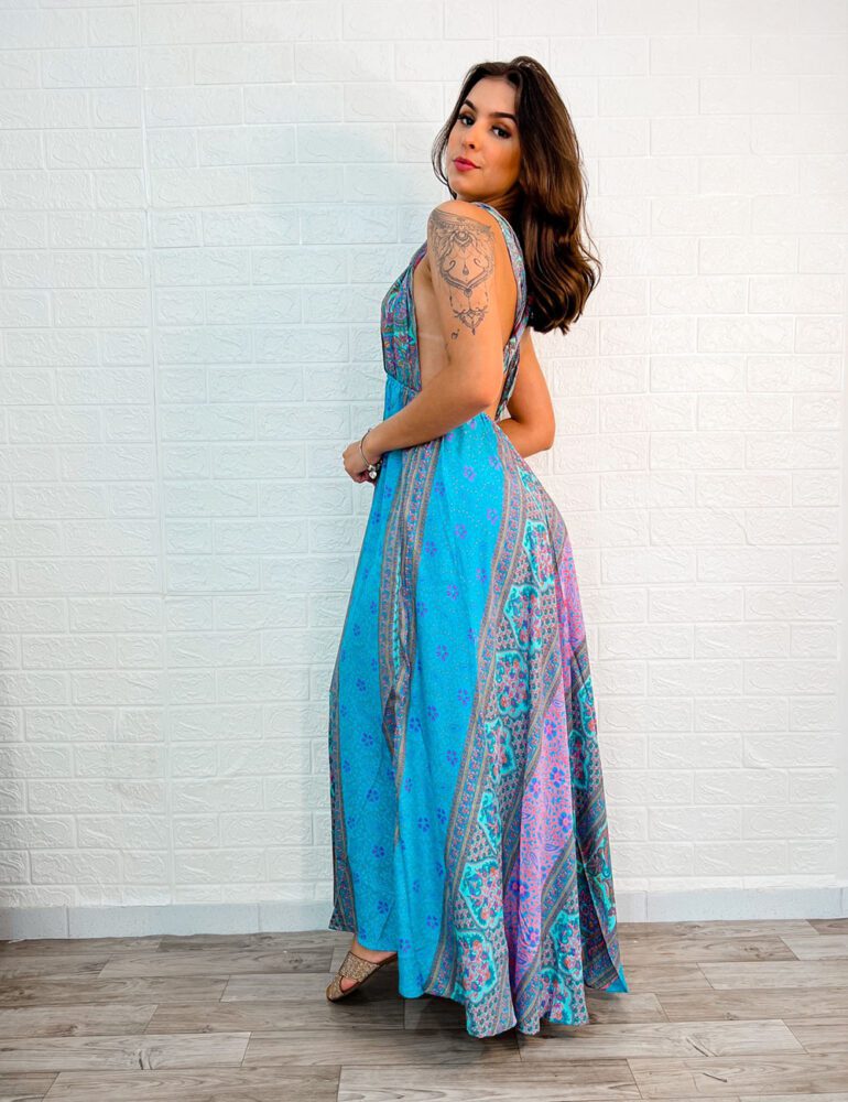 Vestido Longo Indiano Estampado Azul Bebe