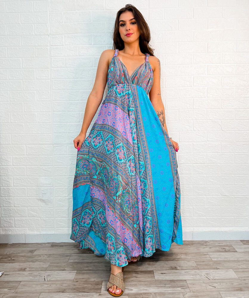 Seja o primeiro a avaliar “Vestido Longo Indiano Estampado Azul Bebe”