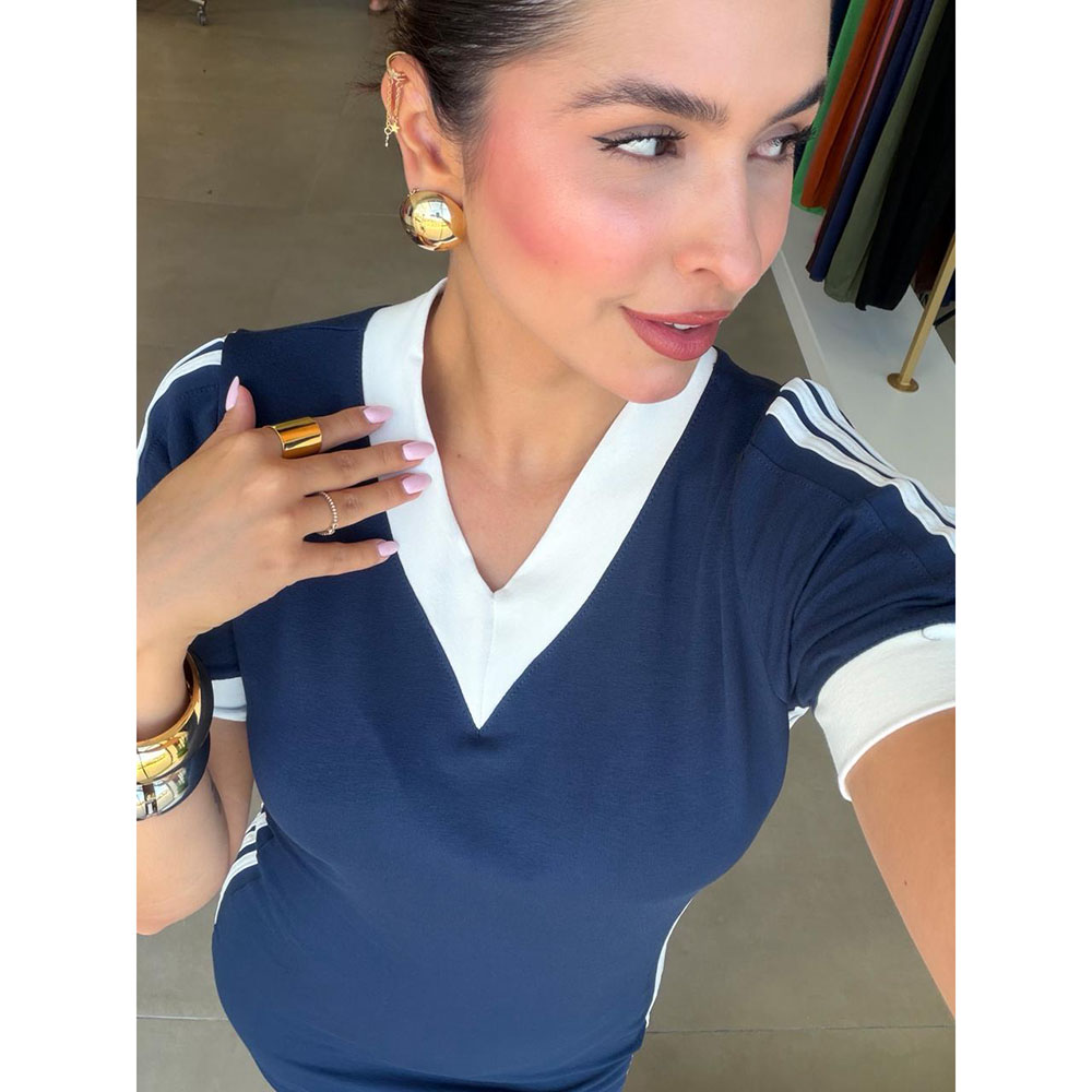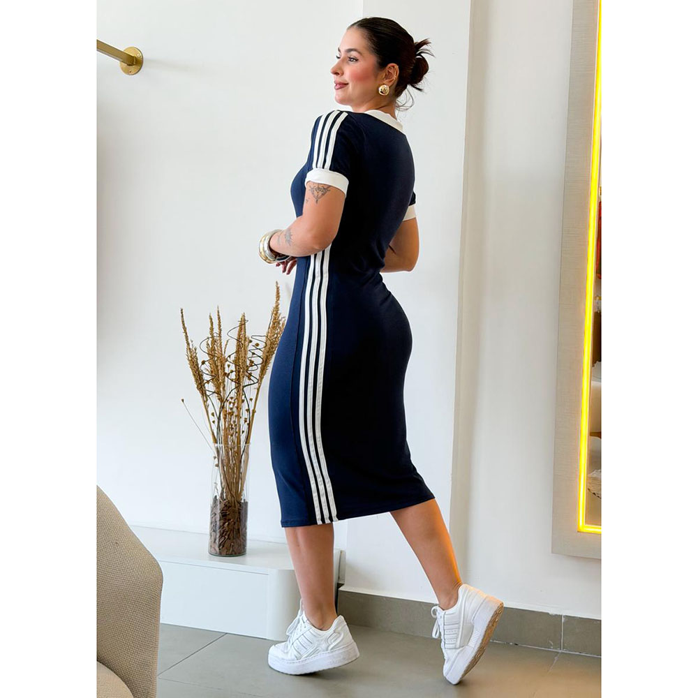 Vestido modelo midi em tecido moletinho com elastano, oferecendo conforto e excelente ajuste ao corpo. Possui detalhe de listras laterais que ajudam a alongar a silhueta e valorizar o caimento. Conta com gola em decote “V” com acabamento branco contrastante e mangas curtas com o mesmo detalhe, Ideal para compor looks com um toque moderno e refinado, unindo praticidade e estilo para diversas ocasiões.