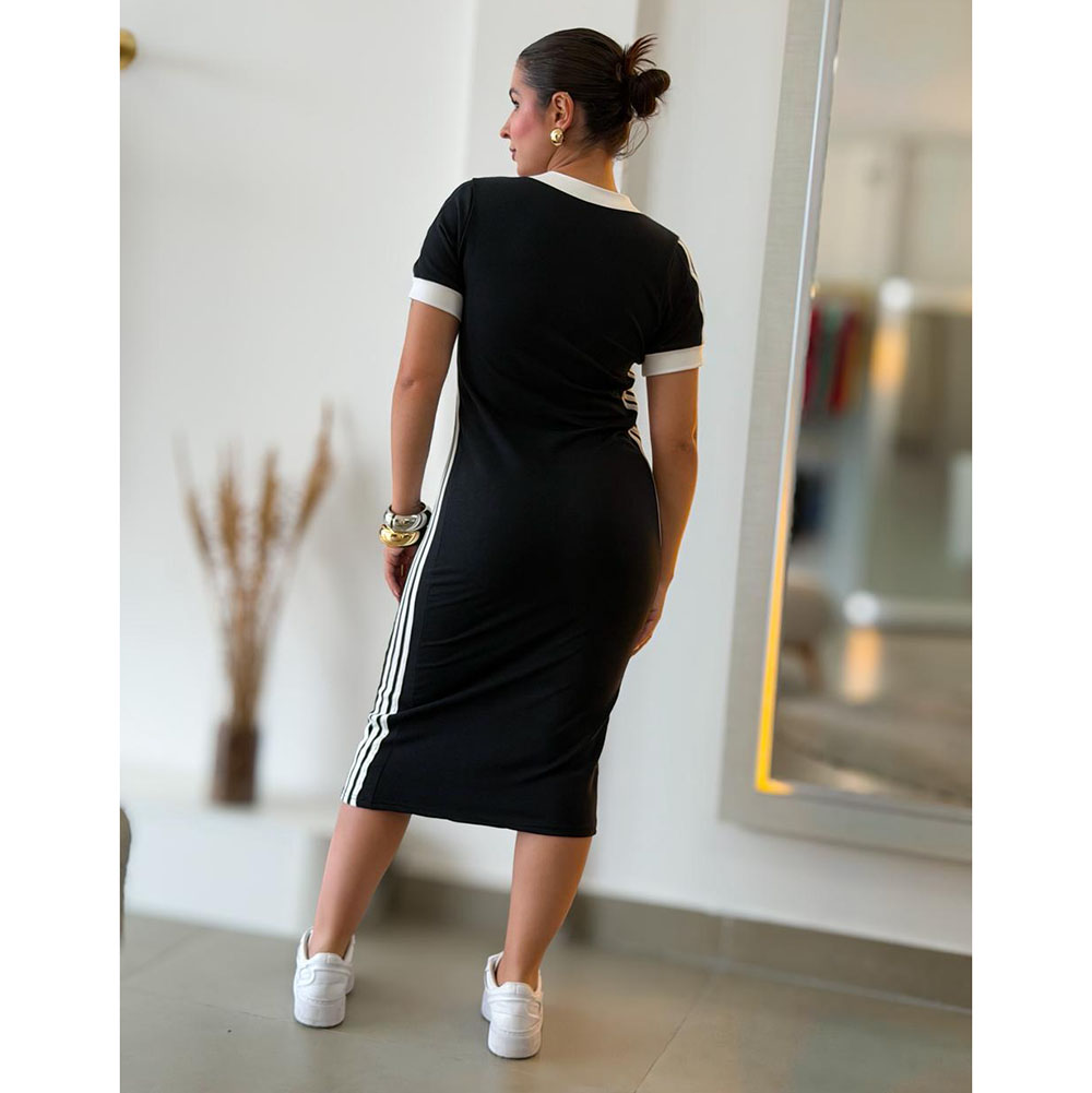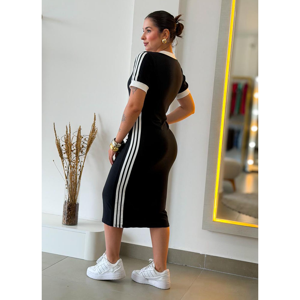 Vestido modelo midi em tecido moletinho com elastano, oferecendo conforto e excelente ajuste ao corpo. Possui detalhe de listras laterais que ajudam a alongar a silhueta e valorizar o caimento. Conta com gola em decote “V” com acabamento branco contrastante e mangas curtas com o mesmo detalhe, Ideal para compor looks com um toque moderno e refinado, unindo praticidade e estilo para diversas ocasiões.