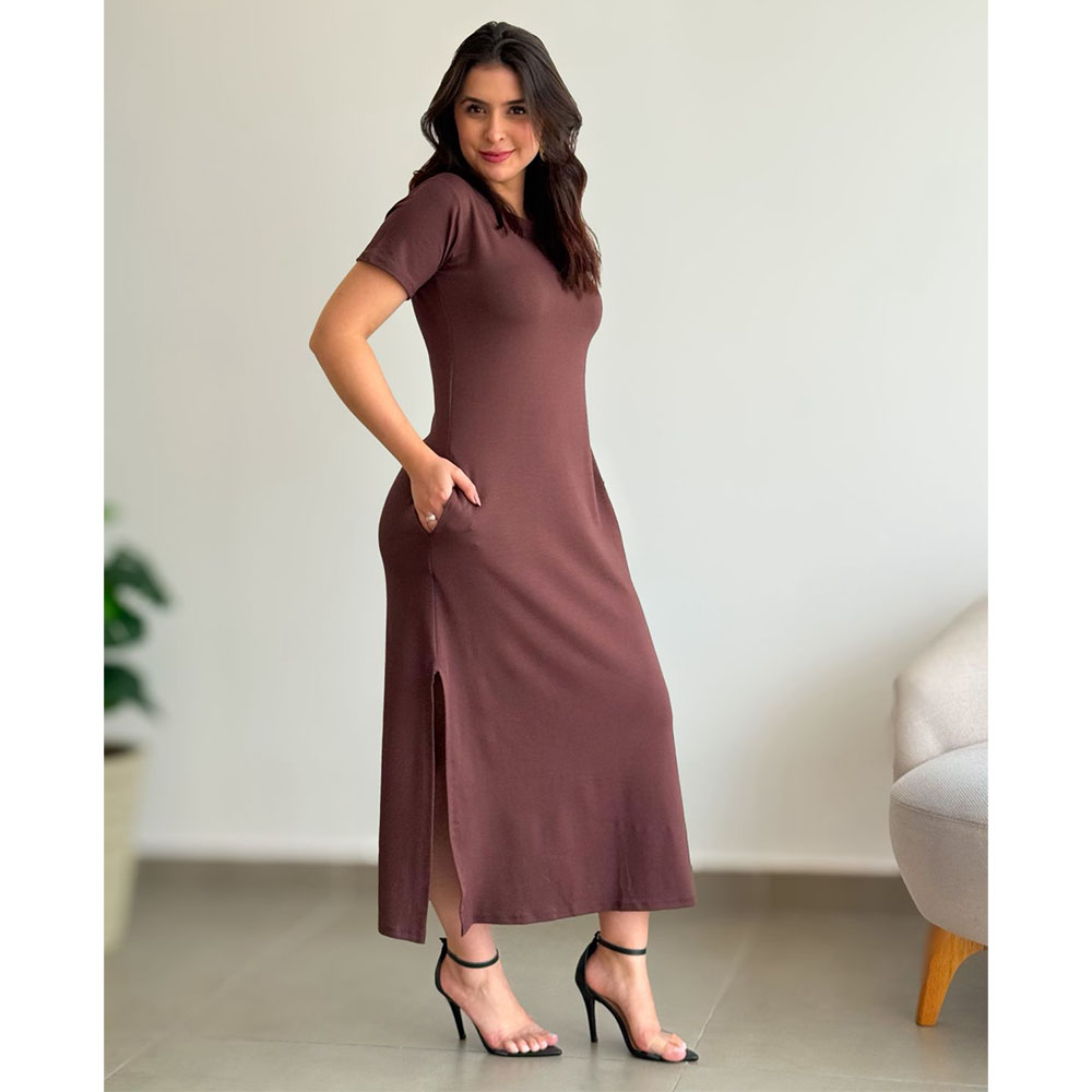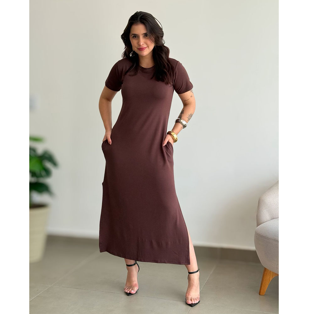 Vestido longo com manga em tecido moletinho com elastano, oferecendo conforto e caimento perfeito que valoriza a silhueta. Possui decote redondo oferecendo conforto, dois bolsos frontais funcionais e fendas laterais que trazem leveza e um toque de charme ao visual, Ideal para compor looks versáteis e modernos.