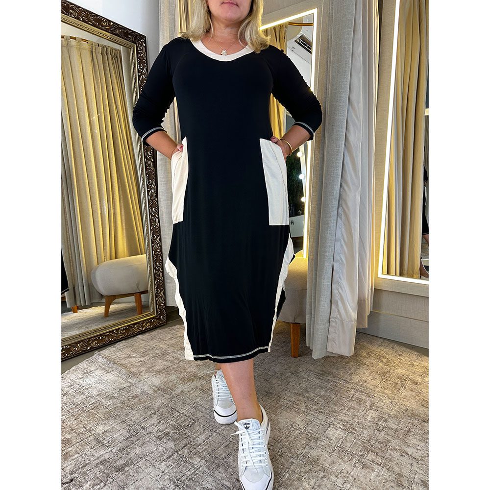 Vestido em viscolycra, com dois bolsos na parte da frente, costuras e detalhes em off white. Modelo perfeito para diversas ocasiões.